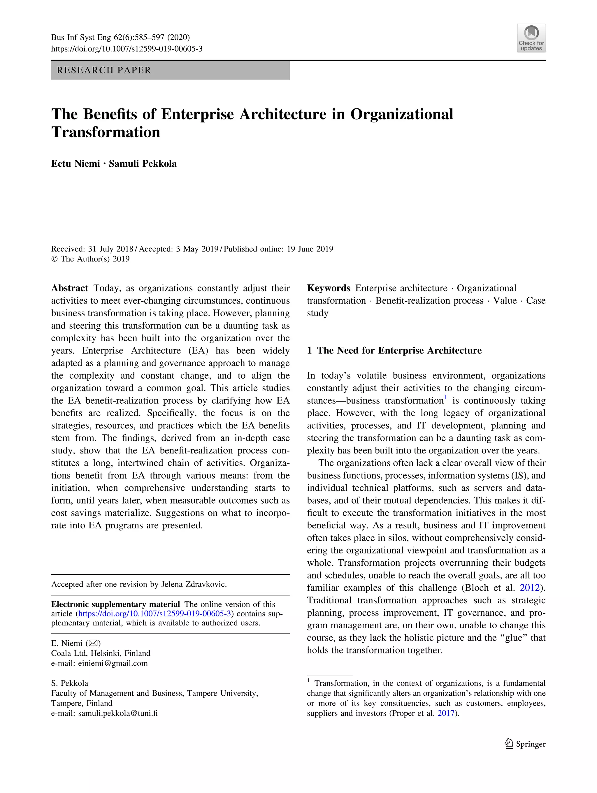 This document summarizes a research paper that studied the enterprise architecture (EA) benefit-realization process. The paper conducted an in-depth case study to clarify how EA benefits are realized. The study found that EA benefits are realized through a long chain of intertwined activities from the initiation of the EA program when comprehensive understanding starts to form, to years later when measurable outcomes like cost savings materialize. Organizations benefit from EA through various means along this process. The paper suggests that to maximize benefits, EA programs should incorporate strategies to realize benefits at all stages of the process.