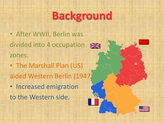 The Berlin Wall was built in 1961 to prevent mass emigration from East Berlin and East Germany to the western sectors. It split families and symbolized the division of Germany and Europe during the Cold War. In 1989, a new government in East Germany announced citizens could freely cross into West Berlin, leading to the fall of the Berlin Wall that November as people celebrated the end of the division. German reunification was formally achieved in 1990.