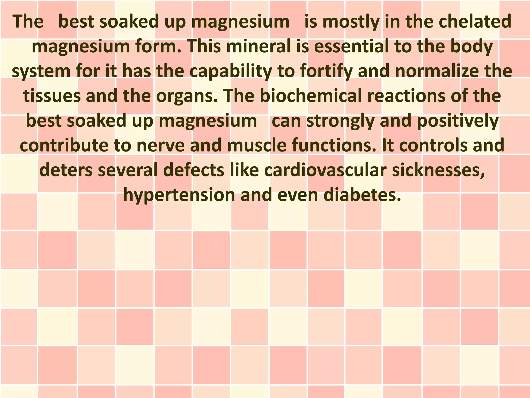 The best absorbed form of magnesium is chelated magnesium, which helps strengthen tissues and organs. It plays a key role in nerve and muscle functions and can help prevent cardiovascular diseases, hypertension, and diabetes. Studies show citrate, malate, gluconate and taurate magnesium are well-absorbed, while magnesium oxide is the least absorbed. Magnesium is also found in foods like green vegetables, nuts, seeds, and milk.