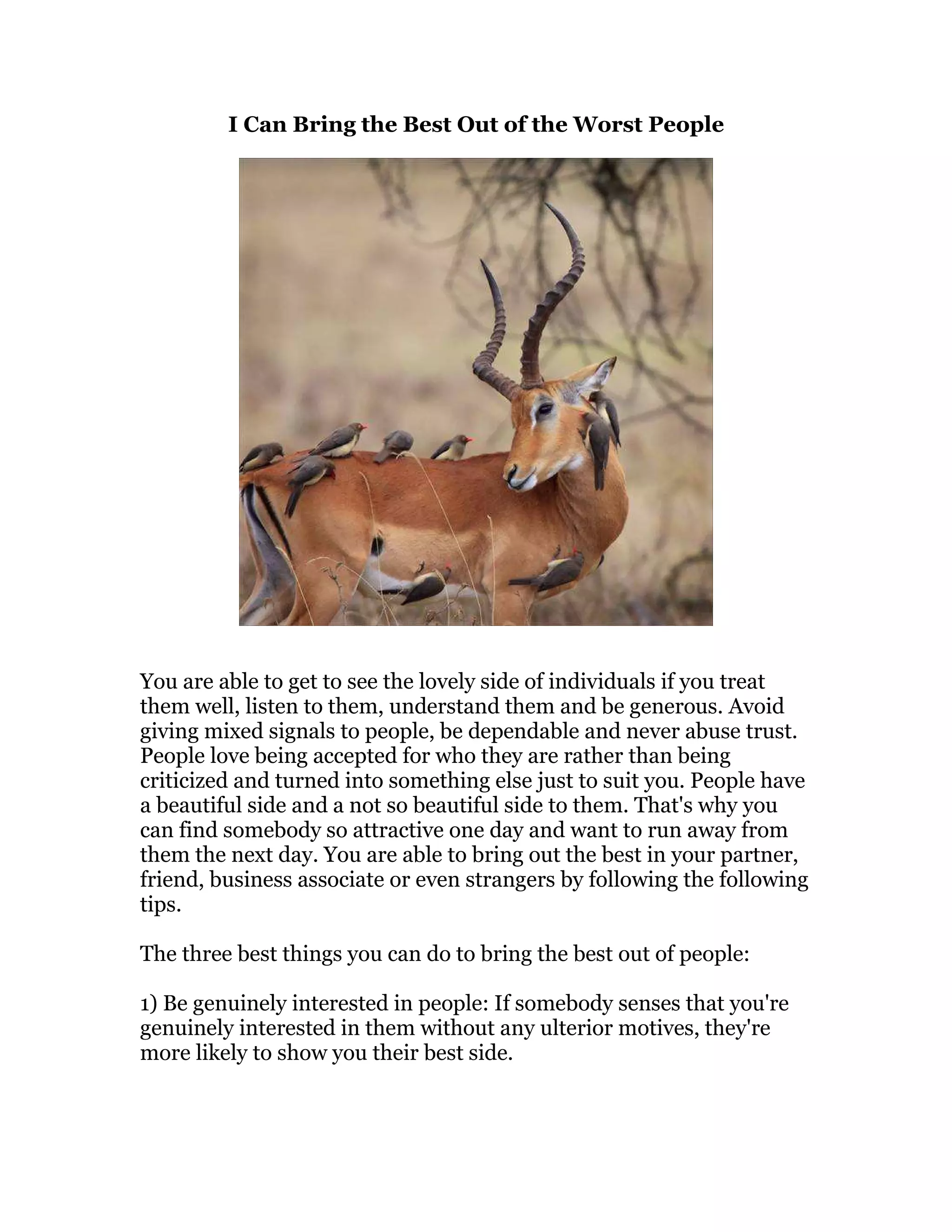 1) By treating people well, listening to them, understanding their uniqueness, and maintaining trust, one can draw out their best qualities rather than criticize them.