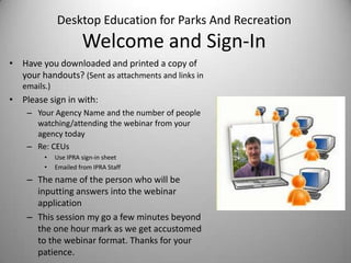 This document provides an overview of a webinar on developing a better business model for parks and recreation agencies. The webinar covered topics like effective pricing strategies, managing donation messaging, leveraging staff knowledge, using incentives, and understanding customers. The presenter emphasized using data and business planning to improve revenue and accountability. Attendees were asked to discuss steps their agency could take to understand customers better or develop new strategies based on the webinar content.