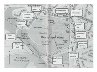 The document provides a historical overview of Beveridge Park in Kirkcaldy, Scotland. It describes how the park was established in 1892 on land purchased from the Raith Estate. It then highlights various areas and features within the park over time, including Southerton House, the fountain, lake, gardens, bandstand, and activities like tennis, bowls, and motor racing. It also mentions neighboring locations outside the park boundaries.