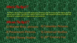 The Big 6 refers to the six major film studios that produce the highest grossing movies. These six studios are Warner Bros., Paramount Pictures, Walt Disney Studios, Columbia Pictures, Universal Studios, and Twentieth Century Fox. With the large production budgets and marketing of The Big 6, it is difficult for smaller independent studios to compete.