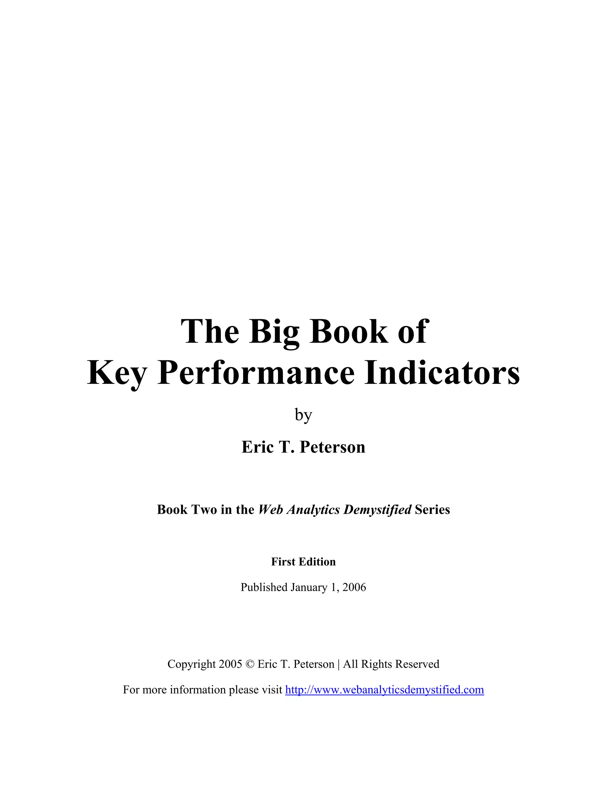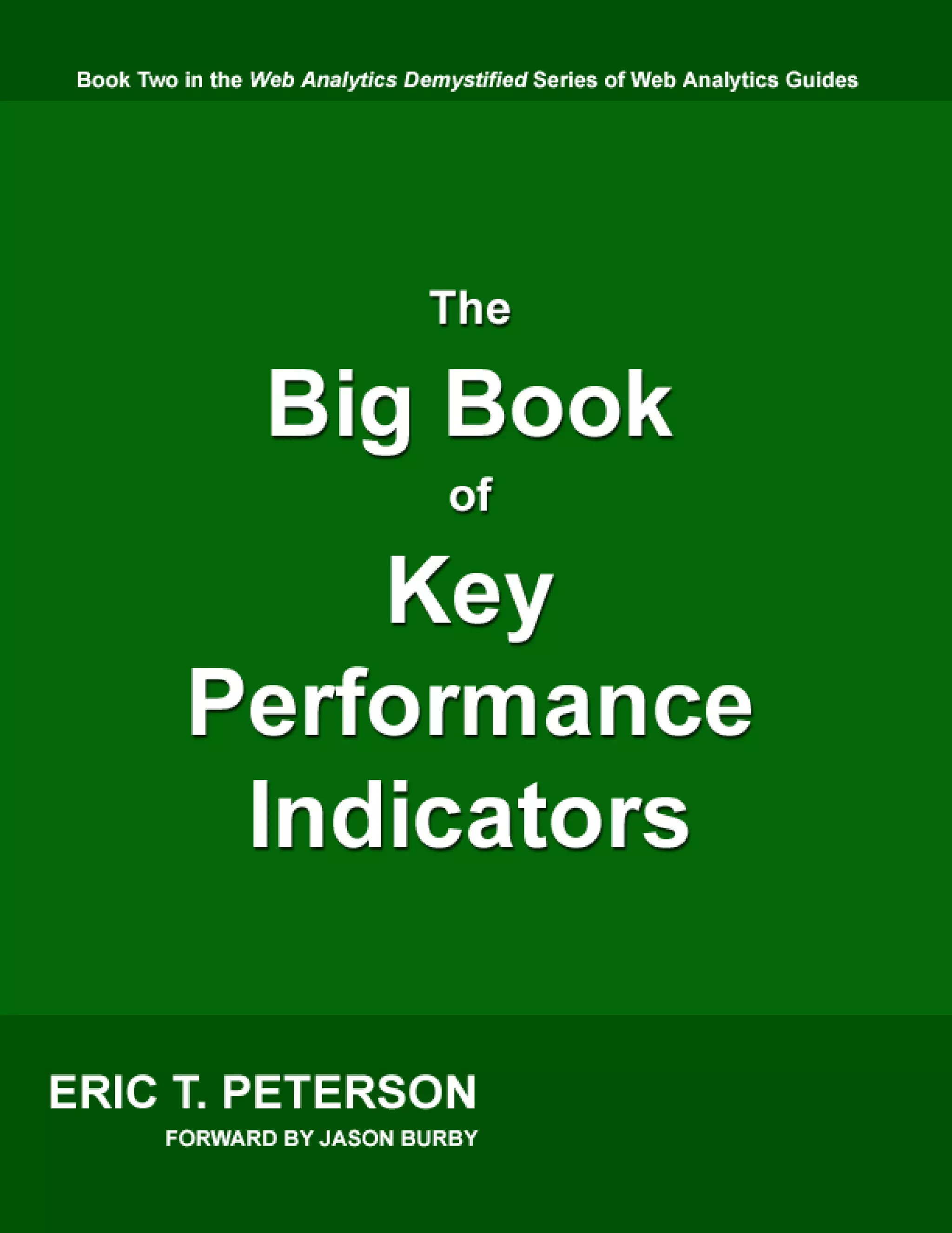 This document is the forward written by Jason Burby for the book "The Big Book of Key Performance Indicators" by Eric T. Peterson. It discusses how most companies have too much web analytics data but lack clear KPIs to measure performance. It states that defining KPIs is crucial but difficult for marketers. The forward explains that the book will provide criteria for what makes a good KPI, examples by industry, and guidance on developing your own KPIs. It aims to help readers better use web analytics tools by first establishing a foundation of key metrics.