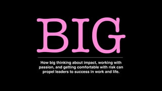 The document emphasizes the importance of big thinking, passion, and risk-taking for success in both work and life. It outlines key steps for achieving significant goals, including starting with a clear vision, embracing learning through action, and fostering community support. It also highlights the potential for impactful change through bold initiatives, illustrated by real-world examples like charity: water and pencils of promise.
