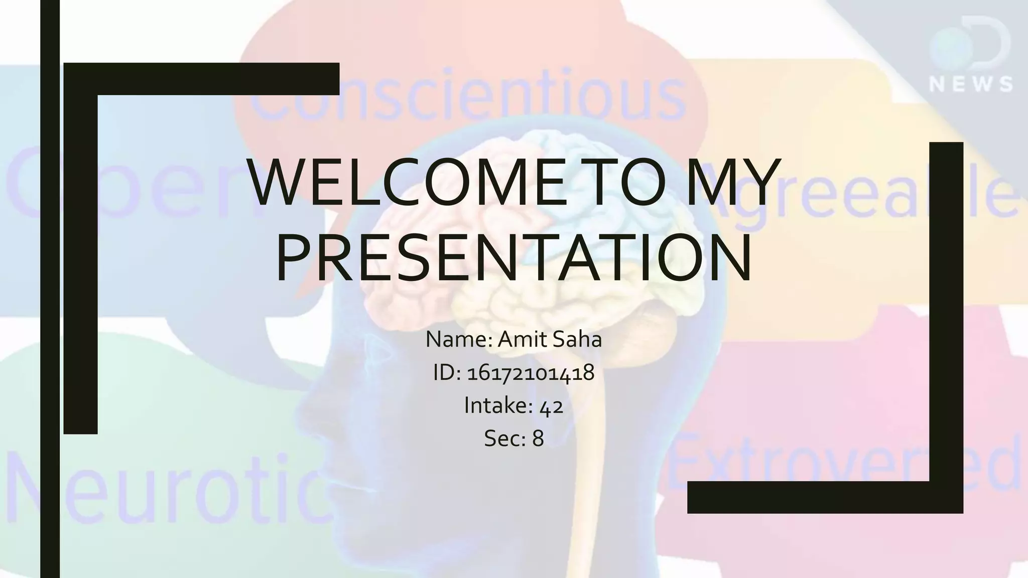 Amit Saha presented on the five personality model which includes extraversion, agreeableness, conscientiousness, emotional stability, and openness to experience. Each trait was defined and Amit provided a self assessment of where he falls on each trait. He sees himself as extraverted by enjoying talking to people, cooperative as agreeable, responsible as conscientious, sometimes nervous but working to manage depression as emotionally stable, and curious with a desire to learn new things as open to experience.