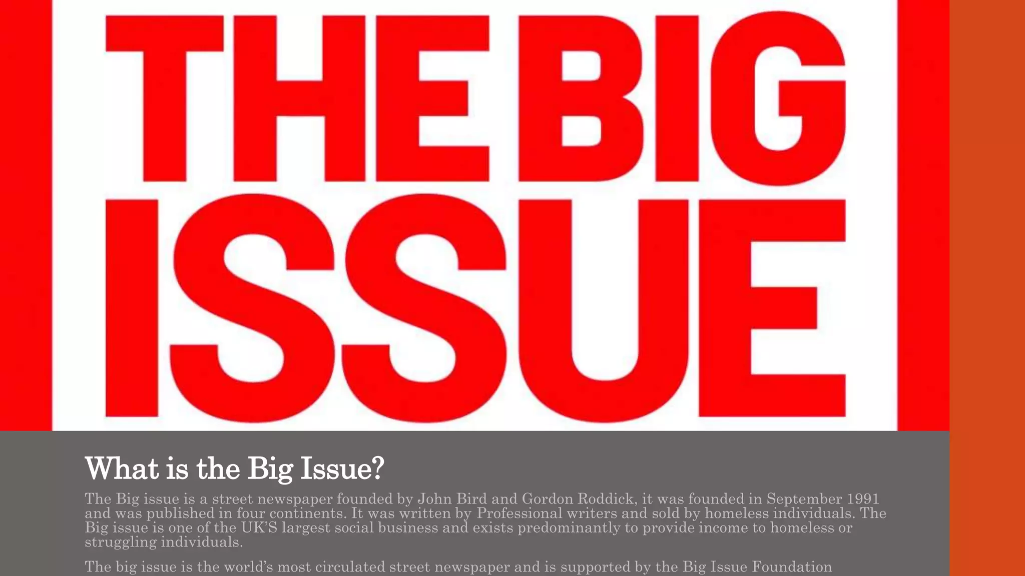 The Big Issue is a street newspaper founded in 1991 by John Bird and Gordon Roddick. It is published in four continents and written by professional writers, but sold by homeless individuals to provide them income. The Big Issue is one of the UK's largest social businesses and exists to help homeless and struggling people. It was inspired by a similar New York newspaper and received start-up funding from The Body Shop. The Big Issue later expanded through the founding of The Big Issue Foundation to provide additional support services to the homeless.