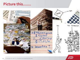 This document discusses the benefits of partnering with ADP for total human capital management. It notes that many companies are out of compliance, operating with disparate systems, and unable to effectively manage their workforce. Through ADP's services, companies can stay compliant, improve their bottom line by consolidating systems, and better find, grow and retain talent. The document highlights ADP's experience, resources, and ability to help companies operate more efficiently and strategically through automated workforce management solutions.
