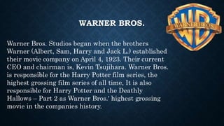 The document summarizes the six major film studios: Warner Bros., Walt Disney Studios, 20th Century Fox, Columbia Pictures, Paramount Pictures, and NBC Universal. Warner Bros. is responsible for the highest-grossing Harry Potter film series. Disney created Mickey Mouse and produced the highest-grossing animated film Frozen. 20th Century Fox's highest-grossing film is Avatar. Columbia Pictures' top earner is Spider-Man 3. Paramount Pictures has three films that earned over $1 billion worldwide, including Titanic. NBC Universal was formed by the merger of NBC and Vivendi and had two of the top three highest-grossing films of 2013 with Fast & Furious 6 and Despicable Me 2