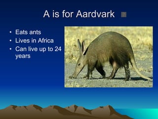 The document presents facts about various animals from A to Z. It provides 1-3 facts about each animal, such as the aardvark eats ants and lives in Africa, black rhinos are aggressive and there are only about 3,600 remaining, and camels store water in their humps and were domesticated before 2000 BC for transportation. The document contains brief 1-2 sentence descriptions of various animals from A to Z.