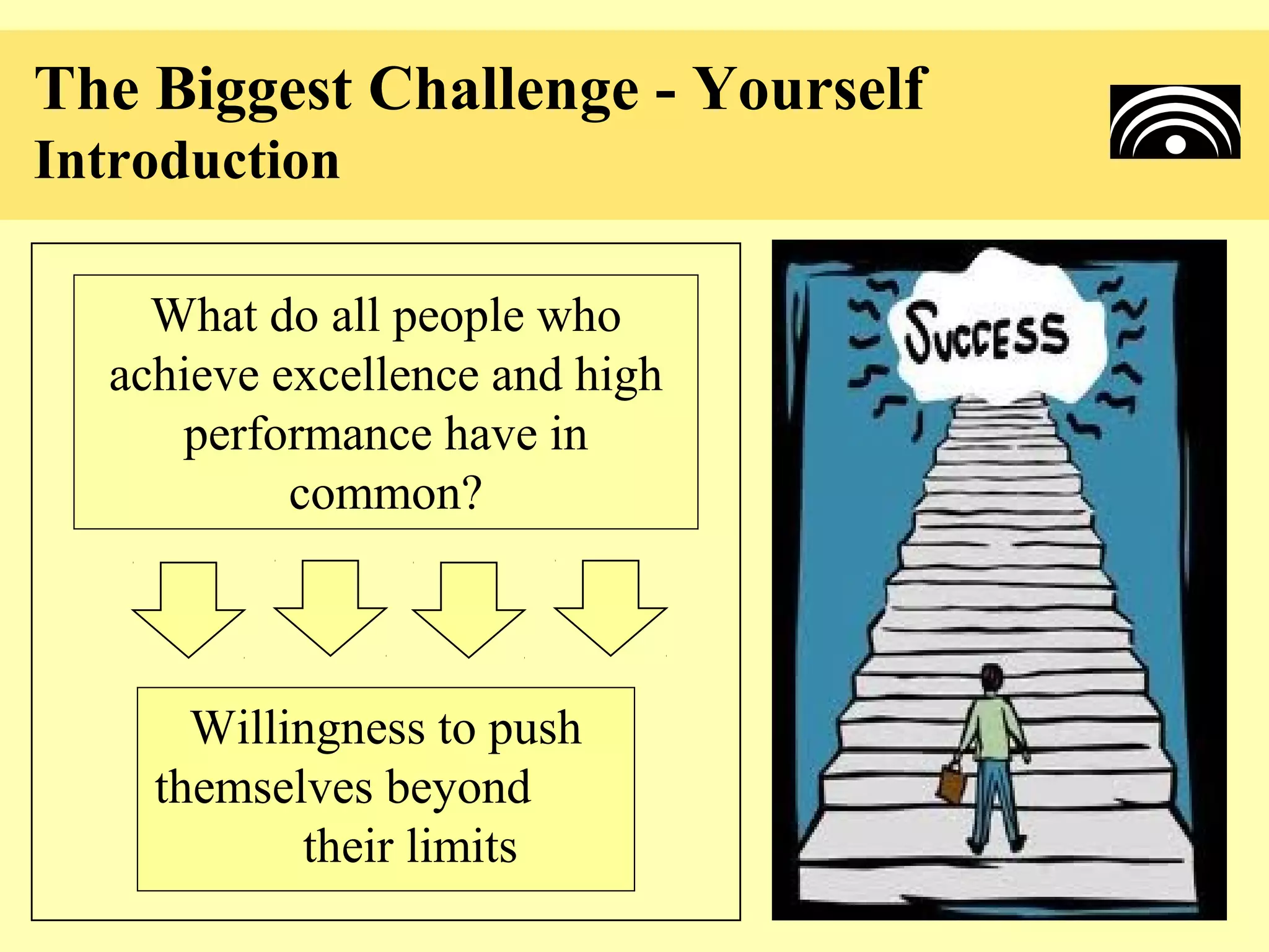 The document discusses overcoming oneself as the biggest challenge. It suggests that high performers are willing to push beyond their limits through hard work, adversity, and discomfort to achieve success. While pushing oneself, it is important not to go too far and risk injury. The main enemies of success are making excuses rather than taking responsibility. To succeed long-term requires going beyond instincts to avoid pain and seek pleasure. Strategies include minimizing temptation, pushing discomfort only in short bursts, and focusing on important challenges for no more than 90 minutes at a time. The conclusion emphasizes that improving oneself is the fastest way to achieve success and happiness.