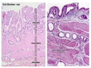 1. The gallbladder can be divided into three parts and lacks two layers. It may also have congenital anomalies.