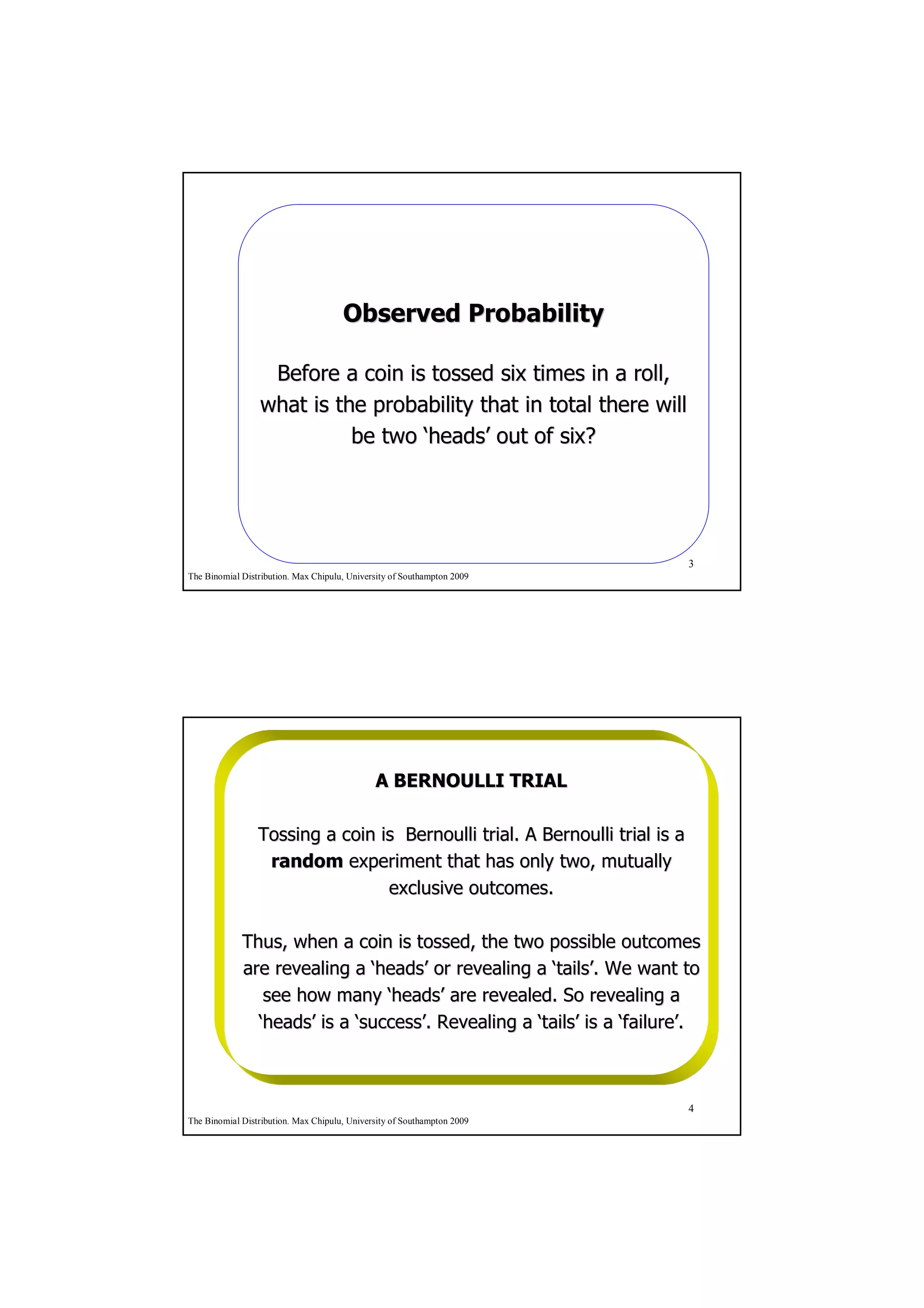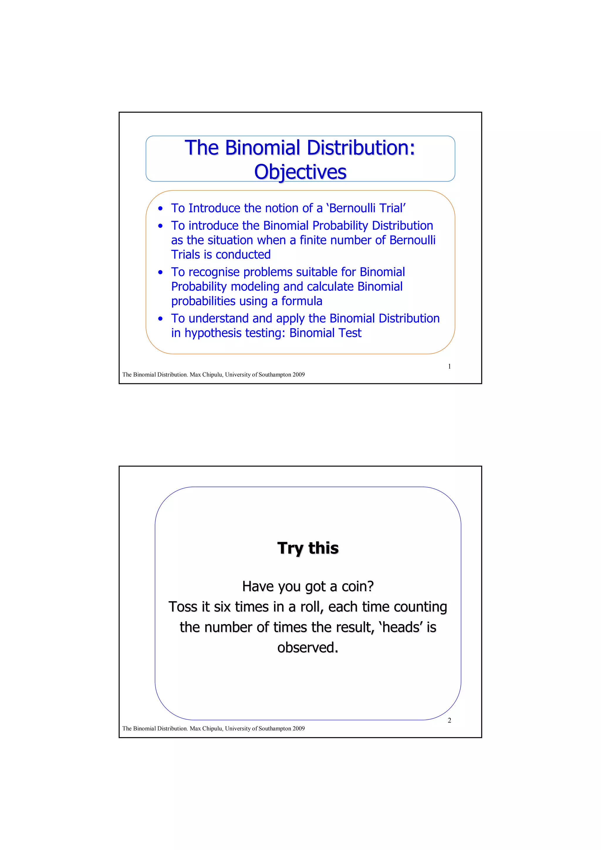 The document introduces the binomial distribution and its applications. It defines a Bernoulli trial as having two mutually exclusive outcomes and explains how the binomial distribution can model situations with a fixed number of Bernoulli trials. It provides examples of calculating binomial probabilities using formulas and the SPSS binomial test. The key concepts are that the binomial distribution applies when there are a fixed number of independent yes/no trials, each with the same probability of success.