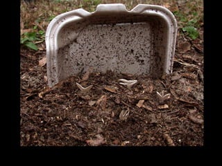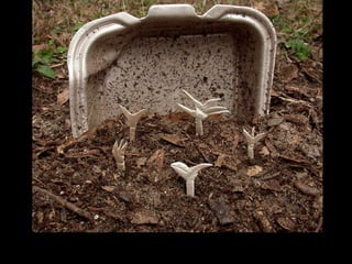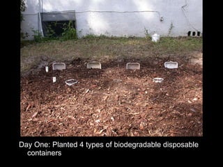 The document summarizes an experiment testing the biodegradability of various disposable food containers in a backyard garden over five months. Two cardboard containers completely broke down, while wax-coated paper cups showed some change. A compostable plastic cup and biodegradable foam showed no visible changes. Surprisingly, an additive in the foam mutated and grew into an edible and healthy herb, demonstrating the potential for disposable products to biodegrade and provide benefits. The experiment highlights the need for commercial composting facilities to fully break down many "eco-friendly" containers within a year.