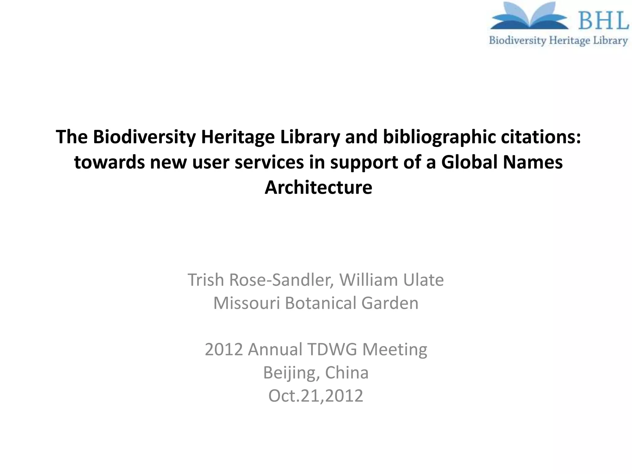 This document discusses the Biodiversity Heritage Library's (BHL) efforts to create a citation repository that would allow users to search and access articles from the BHL. It provides a brief history of related projects like CiteBank. It describes the current capabilities and limitations of accessing citations and full text articles through the BHL. It outlines the next steps needed to fully integrate citations and articles into the BHL by expanding the data model, developing interfaces for adding metadata, and changing how citations and articles are displayed. The goal is to support the Global Names Architecture by facilitating access to taxonomic literature.