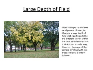 The document discusses several photos taken by Catherine Baker during a photography exercise where she had to take pictures while blindfolded. The photos include trees displaying autumn colors, a high angle shot of a tall tree to convey its power, different shadows cast by the photographer and other objects, an opened conker found on the ground, and a colorful plant from a distance using zoom and a shallow depth of field. Overall, the exercise highlighted how important vision and using a viewfinder is for accurate photography, but that some surprising shots can still be achieved without sight by trial and error.