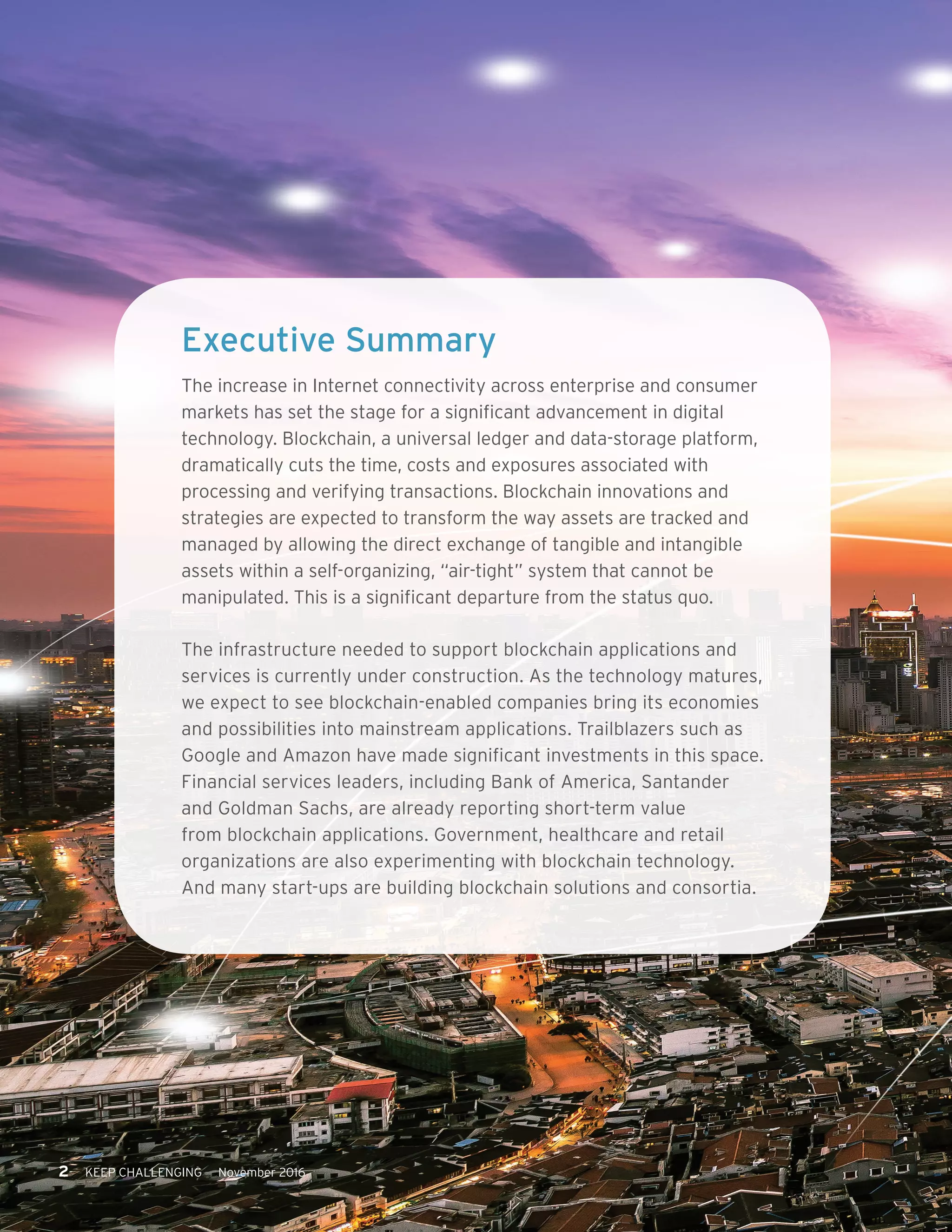 The document discusses the transformative potential of blockchain technology for property and casualty (P&C) insurance carriers by offering a secure, immutable platform for transaction recording and data management. It highlights the increasing investments and experiments within the insurance industry and other sectors, showcasing how blockchain can enhance operational efficiencies, improve customer acquisition, and aid in claims processing through smart contracts. Key barriers such as technological know-how and regulatory clarity are acknowledged, with recommendations for a three-pronged innovation framework to guide carriers in blockchain adoption.
