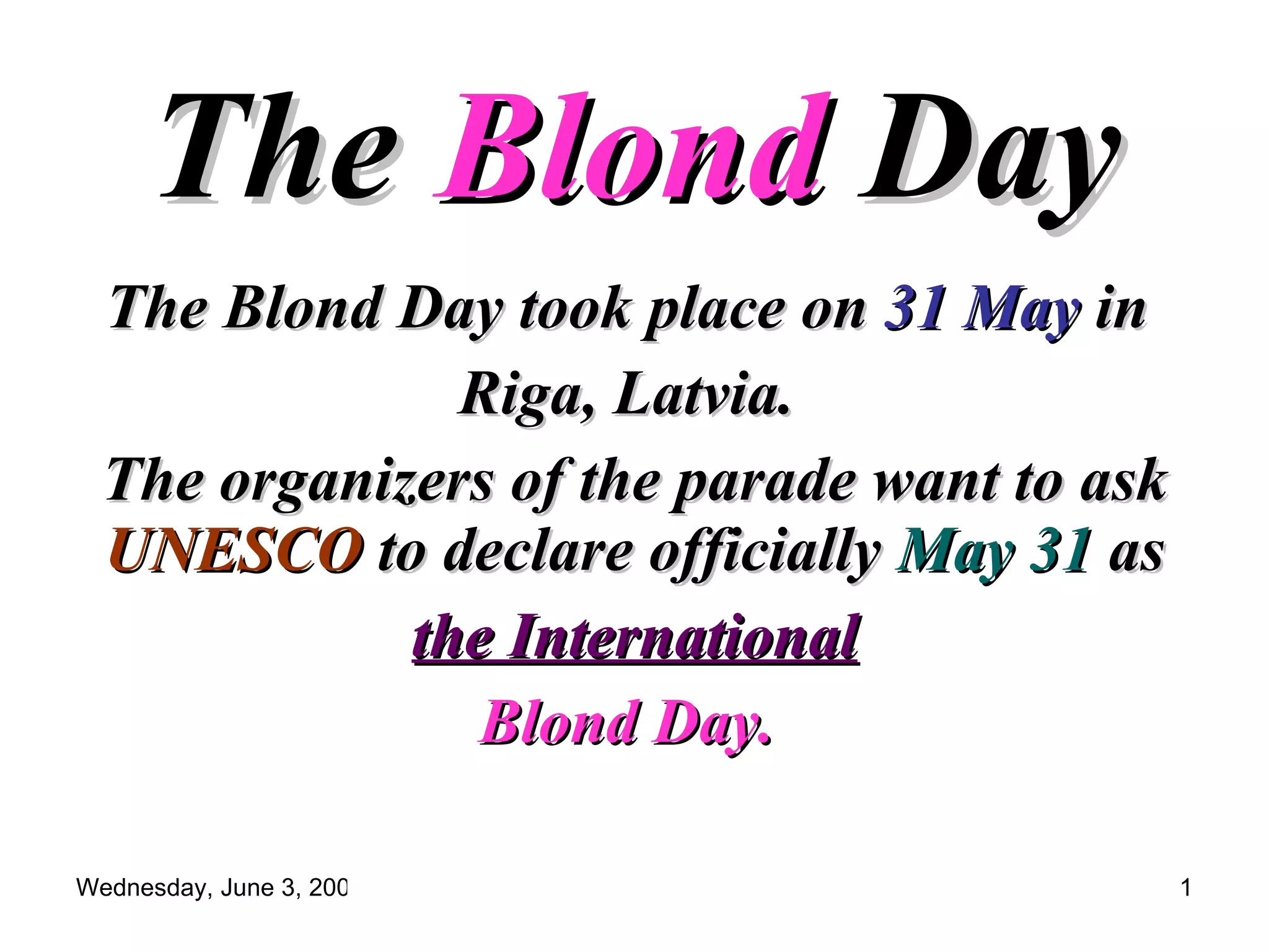 The Blond Day parade was held on May 31st in Riga, Latvia to celebrate blond hair and ask UNESCO to declare May 31st as the International Blond Day.