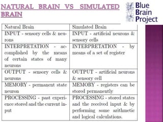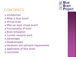 The document discusses the Blue Brain project, which aims to create a virtual brain that can simulate human cognitive functions using advanced computing technology. It covers the functionality, potential applications, and ethical considerations associated with creating a digital version of the human brain, including benefits such as memory preservation and challenges like dependency on technology. The project is a collaborative effort led by IBM and Swiss researchers, utilizing powerful supercomputers and nanobots to interface with biological brains.