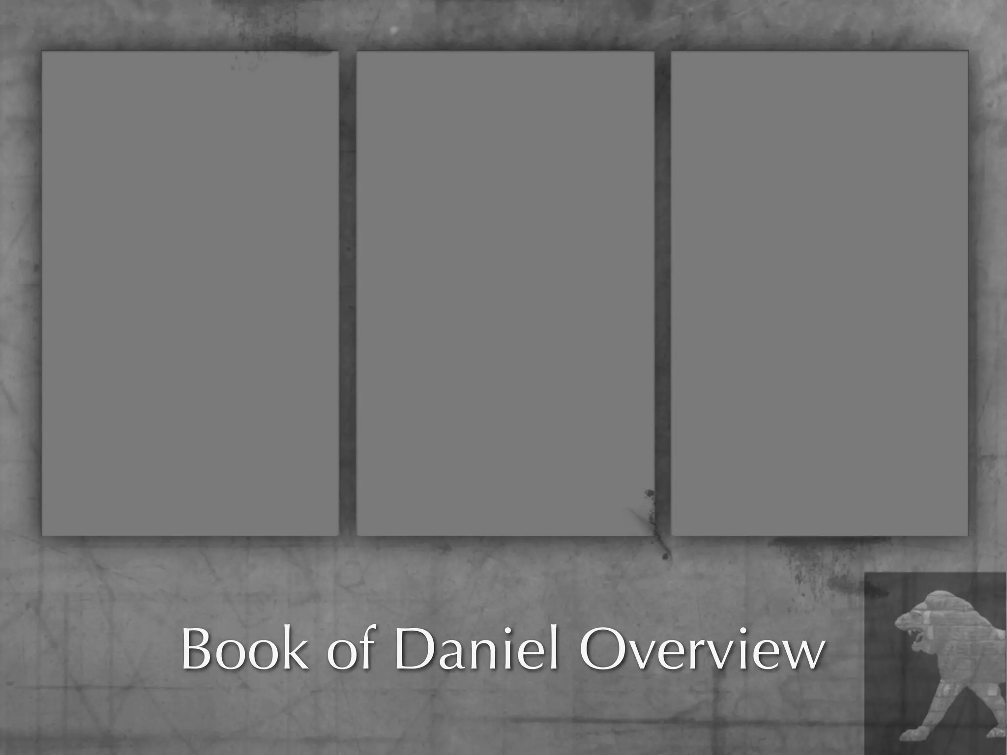 The document provides an overview of the structure and contents of the Book of Daniel. It is divided into three sections: Section I covers Daniel's personal history in chapter 1. Section II contains prophetic visions of Gentile kingdoms from chapters 2-7. Section III contains further prophetic visions related to Israel in chapters 8-12. The overview also notes some key parallels between the visions in chapters 2-3 and 7-8, including their portrayal of four successive empires and prediction of God's eternal kingdom.