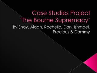 The Bourne Supremacy is a 2004 action thriller and sequel to The Bourne Identity. It starred Matt Damon as Jason Bourne, who is framed for a botched CIA operation. He is forced to go back into action as an assassin to survive and clear his name. The film received positive reviews and was a financial success, grossing over $288 million worldwide. The target audience was mainly 16-34 year old males and the marketing campaign, which included TV ads, posters, and merchandise, helped drive its box office performance.
