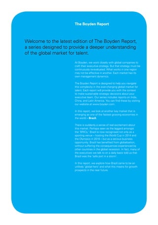 3) Interviews with business leaders in Brazil find widespread optimism about the market and view it as "the place to be" for business, with growing consumer markets, energy potential, and infrastructure development driving opportunities.