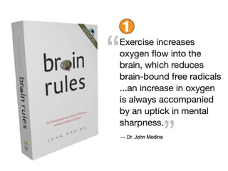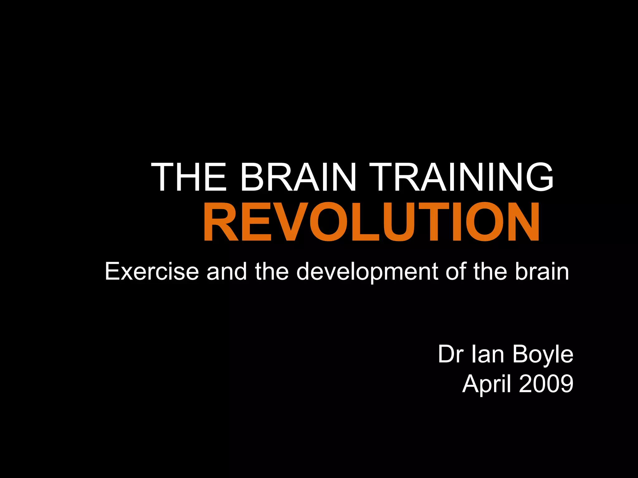 The document discusses the importance of brain training and exercise in enhancing cognitive function, including memory and learning, while preventing mental health issues like Alzheimer's. It highlights the impact of physical fitness on academic performance, as evidenced by improved results in students after incorporating exercise into their routines. Additionally, it addresses the effects of environment and experiences on brain plasticity, advocating for exercise as a means to promote neurogenesis and overall brain health.
