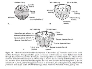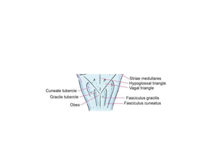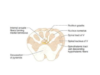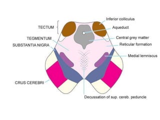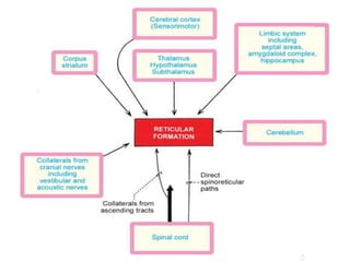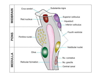 The brainstem consists of three parts - the midbrain, pons, and medulla. It connects the spinal cord to the forebrain and contains nuclei that control vital functions like breathing and heart rate. It also contains tracts that relay signals between the spinal cord and higher brain centers. The reticular formation is a network of fibers and neurons throughout the brainstem that plays roles in motor control, sensory processing, autonomic functions, and maintaining alertness. Important structures in the brainstem include the cranial nerve nuclei, pyramidal tract, olives, and red nucleus.
