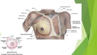The breast extends from the 2nd to 6th ribs and consists of 15-20 lobes that radiate out from the nipple. Each lobe contains ducts that open on the nipple and deliver milk. The breasts develop during puberty under the influence of hormones and further enlarge during pregnancy as the ducts and milk-producing alveoli grow. Lymph drains from the breasts to axillary and internal thoracic lymph nodes, and the breasts receive blood supply from intercostal and thoracoacromial arteries.
