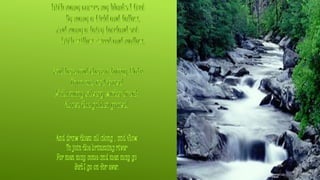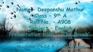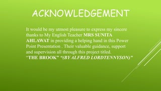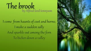 The document provides context and analysis of the poem "The Brook" by Alfred Lord Tennyson. It summarizes that the poem uses the brook as a metaphor for human life. As the brook travels through villages and over hills, it represents a person carrying family and friends through life. The brook flows until it reaches a river, representing how humans are mortal while nature is immortal. It then provides biographical details of Tennyson and examples of poetic devices in the poem.