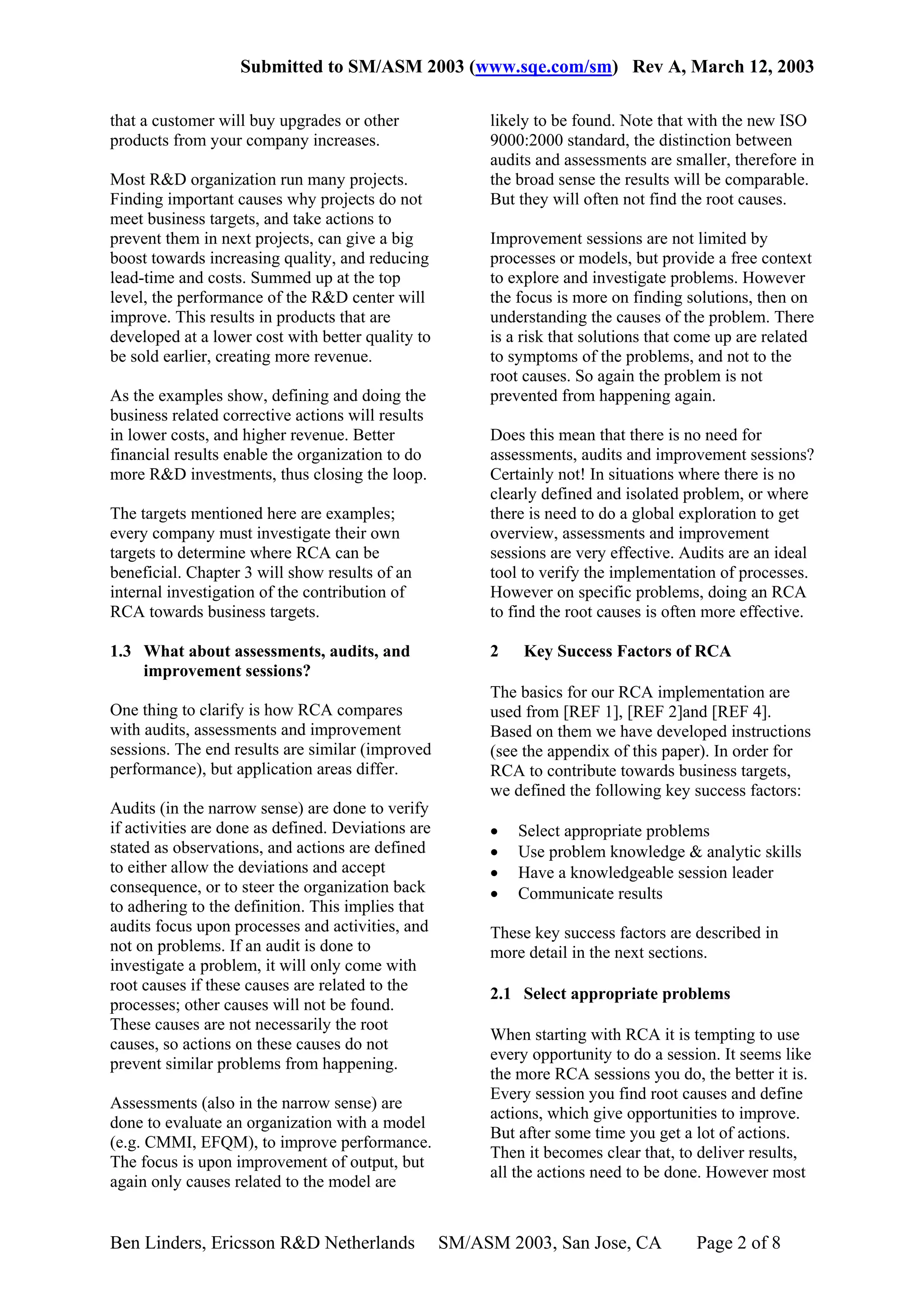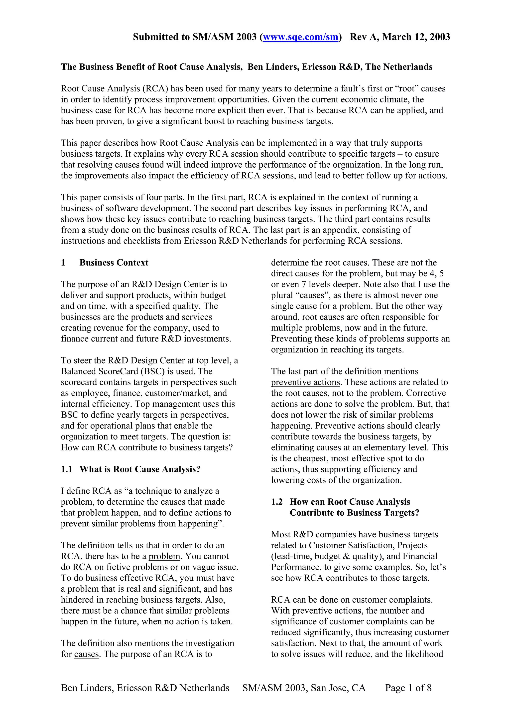 The document discusses the business benefits of Root Cause Analysis (RCA) in improving organizational performance and reaching business targets in software development. It outlines effective implementation strategies for RCA, identifies key success factors, and emphasizes the need for understanding underlying causes rather than just symptoms of problems. The paper concludes with findings from a study showing RCA's effectiveness in addressing major customer issues and contributing to organizational efficiency and financial performance.