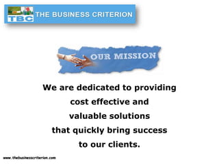 This document describes The Business Criterion consulting and training company. It provides cost effective and valuable solutions to clients based on 25 years of management experience in Asia and Africa. The Business Criterion offers consulting and training services in areas like warehouse management, customer service, and brand building to small and medium enterprises in Singapore and Southeast Asia. It is owned and operated by Petros Zenieris out of Singapore.