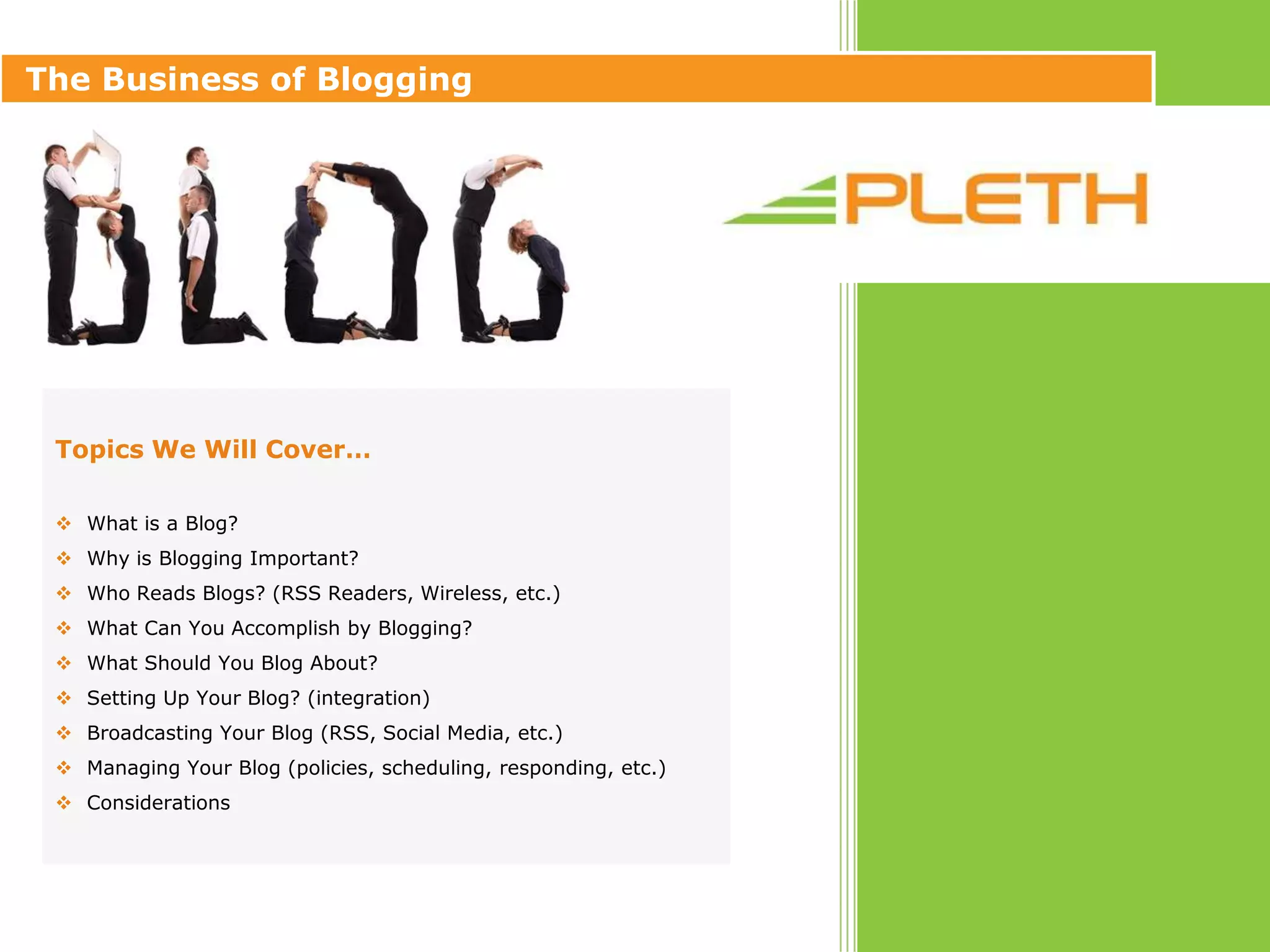 The document discusses the benefits and best practices for businesses that want to start a blog. It covers topics like what a blog is, why blogging is important for businesses, who reads blogs, what businesses can accomplish through blogging, content topics to cover, how to set up a business blog, ways to promote the blog, blog management strategies, and considerations for starting a business blog. The overall message is that blogging allows businesses to openly communicate with customers, publish fresh content regularly, and reap benefits like improved search engine visibility, brand recognition, and customer relationships when done effectively.