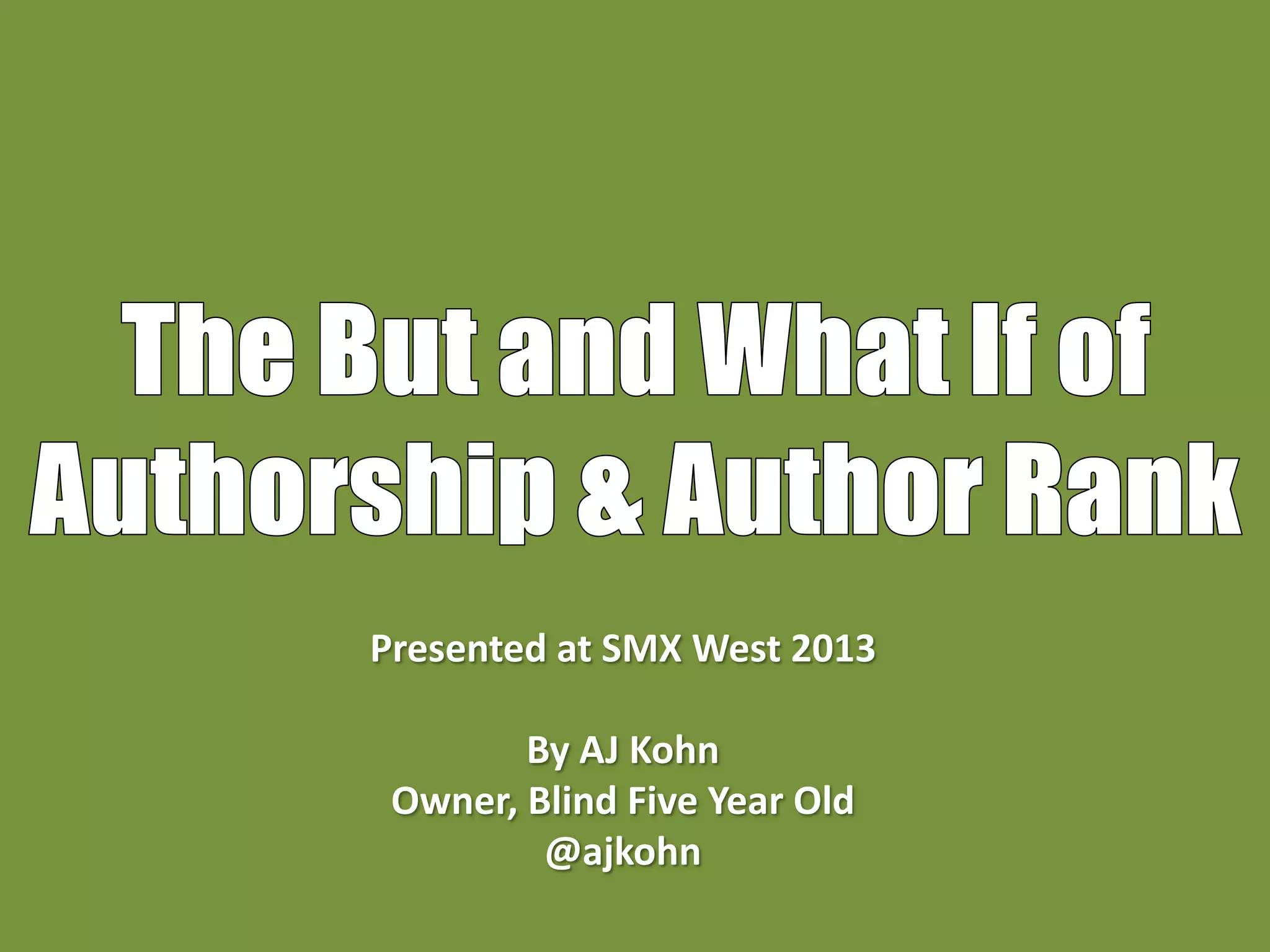 AJ Kohn presented at SMX West 2013 on the importance of authorship in search results. He emphasized that verified online profiles could rank higher and act as a click-through rate magnet. Kohn also highlighted the potential irrelevance of remaining anonymous in the digital landscape.