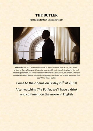 The document announces a showing of the 2013 film The Butler at the cinema for NI2 students at Embajadores EOI on Friday the 29th at 8:10 PM. The film stars Forest Whitaker as Cecil Gaines, an African American butler who works in the White House for 34 years and witnesses important events of the 20th century. After the movie, the students will have a drink and discuss the film in English.