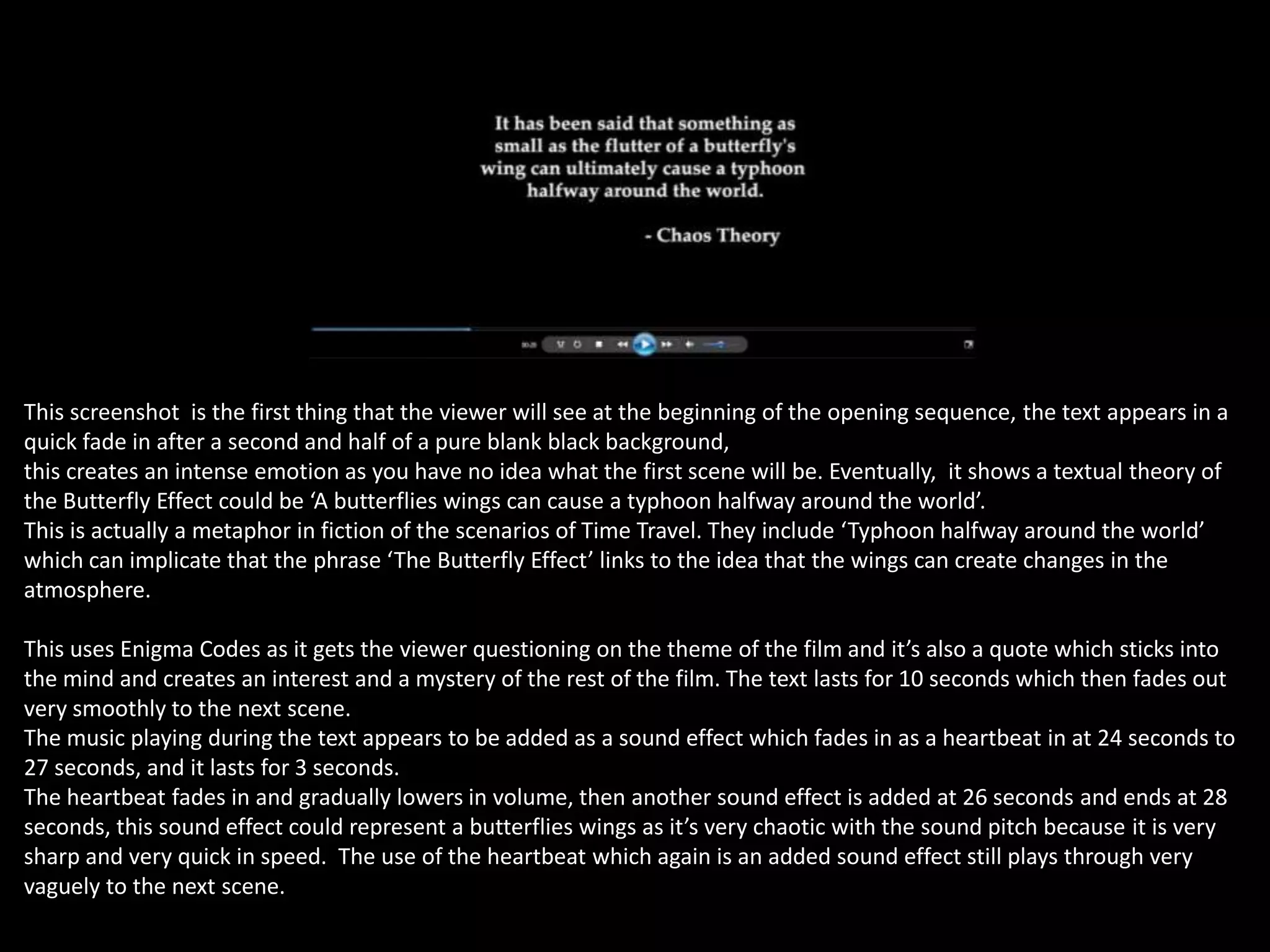The document analyzes the opening sequence of a film, focusing on the emotional and visual effects of the scene's editing, sound, and lighting. It discusses the use of the butterfly effect metaphor, enigma codes, and the protagonist's characterization through costume and camera work. The piece highlights the gradual build-up of suspense and the introduction of key themes such as mystery, identity, and urgency as the narrative unfolds.