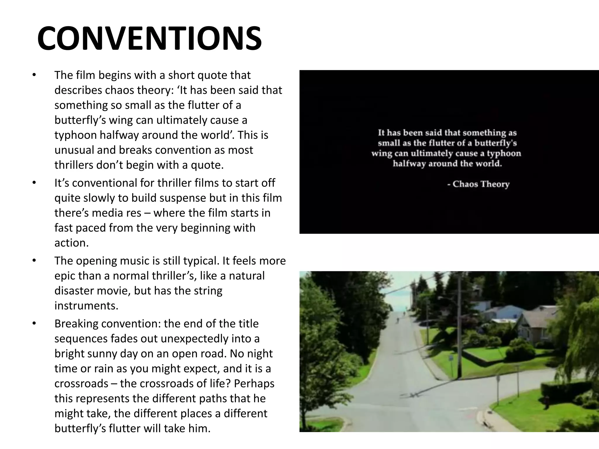 This document provides an analysis of cinematography, sound, and mise-en-scene techniques used in the thriller film "The Butterfly Effect". It notes that the film breaks conventions by starting with a quote about chaos theory and with fast-paced action from the beginning. Titles are displayed over footage to not distract from the story. Close-up shots of a diary indicate it is key to understanding why the protagonist risks his life. Camera techniques like close-ups and tracking shots build a sense of the protagonist being persecuted and chased. Mise-en-scene depicts the protagonist in animal-like positions to seem like a dangerous, hunted creature.