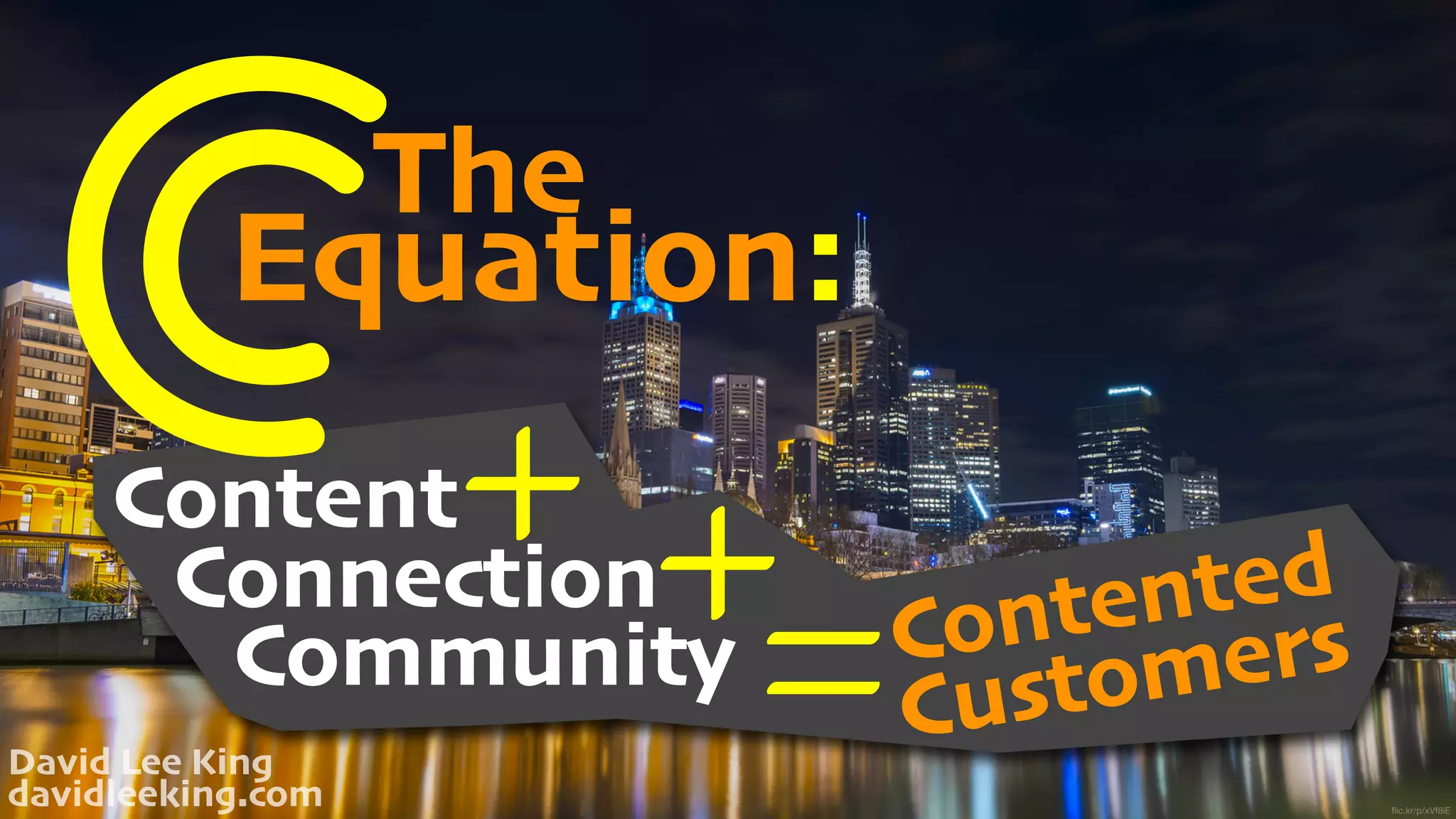 The document discusses the equation of content, connection, and community as fundamental to achieving contented customers. It highlights the importance of libraries and digital content in fostering community connections and encouraging customer engagement. The emphasis is placed on utilizing various digital platforms to enhance interaction and promote library services.