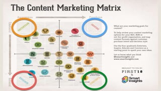 The document discusses effective content marketing strategies emphasizing authenticity, understanding personas, and engaging communities. It highlights the importance of tailoring messages and utilizing various content formats to connect with potential customers and foster relationships. Key themes include challenging the status quo, delivering value, and creating content that resonates emotionally with audiences.