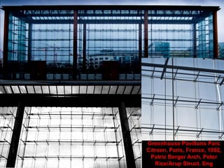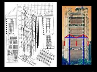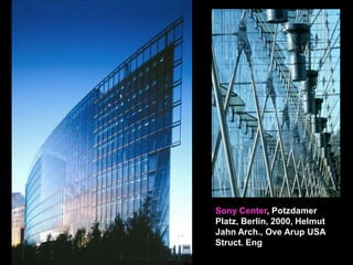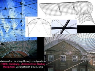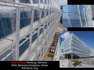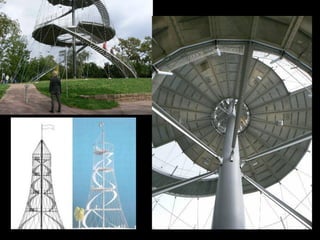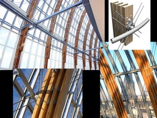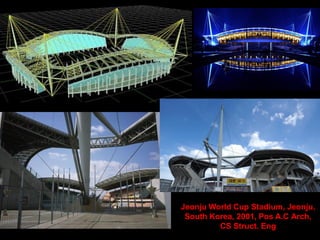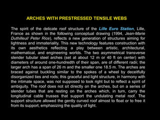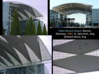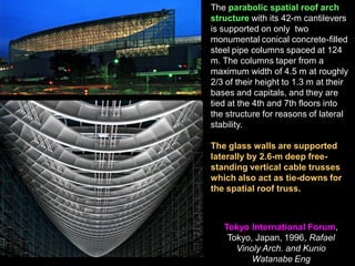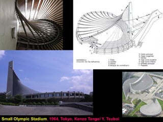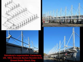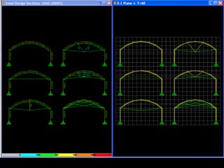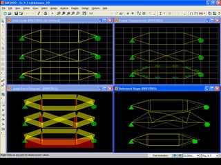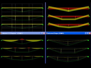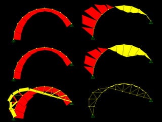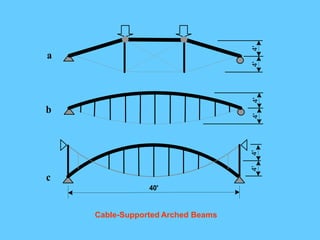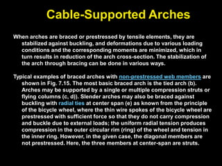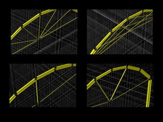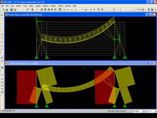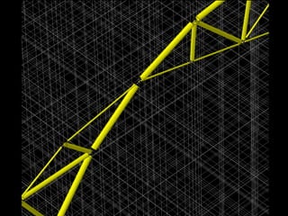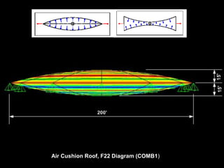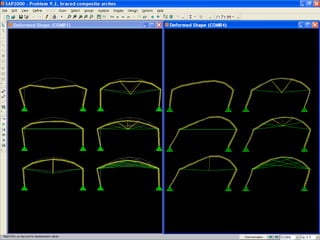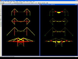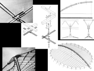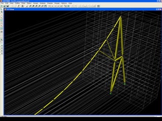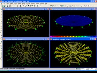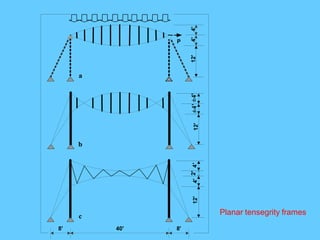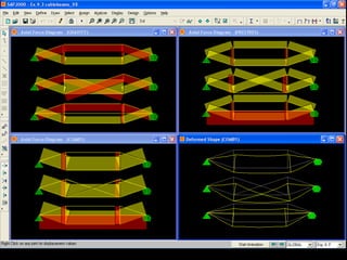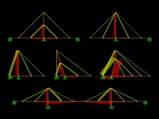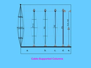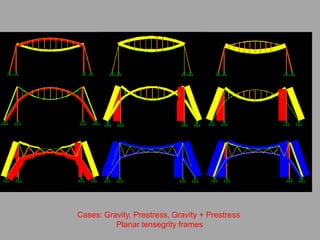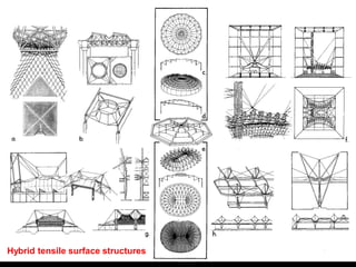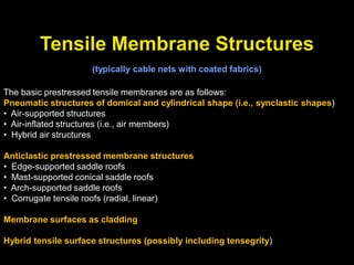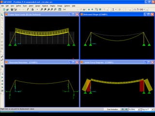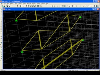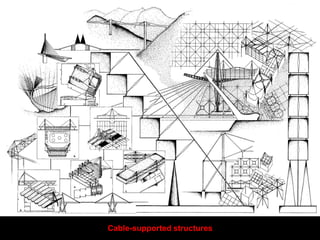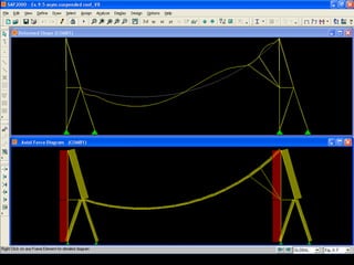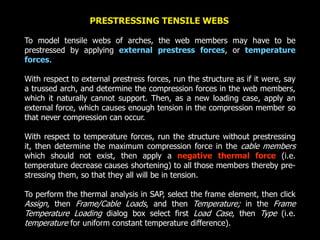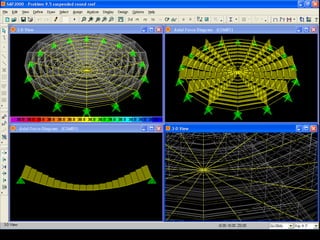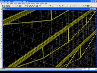 The document discusses the design and analysis of cable structures and tensile systems using SAP2000 software, emphasizing the flexibility and unique geometries of these structures. It highlights various construction techniques, material properties, and considerations for stability, including prestressing and temperature effects. Additionally, it provides guidance on using the software for modeling cable behavior and conducting nonlinear analyses to account for large deflections.