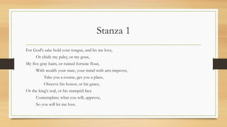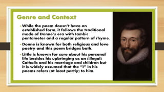 The poem argues that the poet and his beloved should be allowed to love without interference from others. It uses metaphysical conceits to defend their love, comparing themselves to various animals and objects. The poet asserts that even if their love is not suitable for traditional tombs and memorials, it will live on through the verses of poetry. The poem concludes by suggesting that after their deaths, others will revere their love and invoke them as examples of true love.