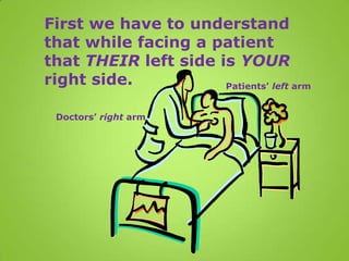 The document summarizes the flow of blood through the four chambers of the heart. It describes how deoxygenated blood enters the right atrium from the superior and inferior vena cava and coronary sinus. It then flows to the right ventricle through the tricuspid valve and is pumped to the lungs through the pulmonary valve to become oxygenated. Oxygenated blood returns to the left atrium via the pulmonary veins and flows to the left ventricle through the bicuspid valve to be pumped out to the body through the aorta. The blood then circulates through the arteries and returns deoxygenated to the heart through the veins to repeat the cycle.