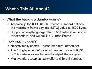 The document discusses the case against using jumbo frames on the internet. It argues that while jumbo frames aim to improve transfer efficiency, path MTU discovery is flawed and unreliable, making it difficult to negotiate MTU sizes across network boundaries. The document also notes that jumbo frames are unnecessary today given modern networking capabilities, and that enabling them internet-wide would likely cause more problems than benefits due to the inherent issues with path MTU discovery and silently dropped packets from MTU mismatches.