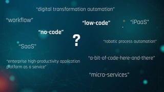 The document discusses low-code development platforms (LCDPs), which allow users to create applications through graphical user interfaces, thereby speeding up development and reducing reliance on skilled programmers. It highlights the growth of the low-code market, the increasing importance of citizen developers, and the ability of these platforms to modernize legacy systems and automate specific tasks. As of 2024, low-code is expected to account for over 65% of application development activity, significantly changing how software is built and maintained.
