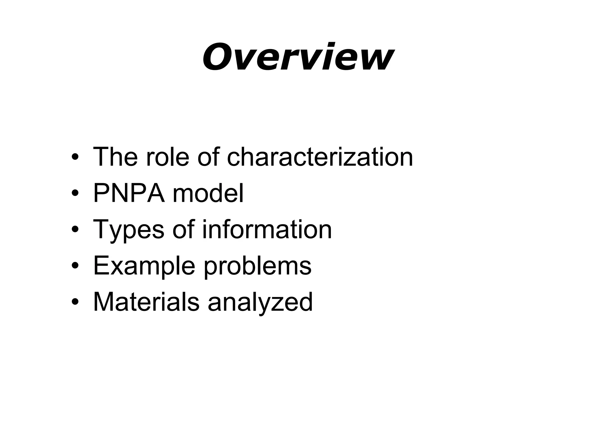 2. It introduces the PNPA model which relates nanostructured materials, processing requirements, and characterization tools and approaches.
