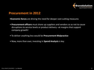 The document discusses how procurement officers can avoid malpractice through effective spend analysis. It states that economic pressures require deeper cost cutting while maintaining service levels and vendor relationships. It then presents spend analysis as key, outlining the formula of visibility, analysis and process leading to success. It details how spend analysis provides visibility into spending and allows benchmarking and best practices analysis to drive better terms. Process is also important to identify needs, manage contracts and service levels. Spend analysis is positioned as the foundation for best-in-class procurement.