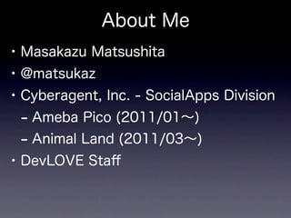The document discusses the implementation of MongoDB in the social game 'Animal Land' developed by CyberAgent, Inc. It outlines the system architecture, benefits of MongoDB such as scalability and flexibility with data structures, and various development considerations including performance, infrastructure, and troubleshooting. Current challenges include online backups and shard management during upgrades.
