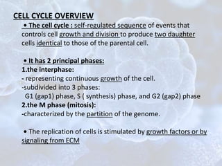 The cell cycle is the regulated process by which cells grow and divide to produce two daughter cells. It has two main phases: interphase and mitosis. Interphase consists of G1, S, and G2 phases where the cell grows and duplicates its DNA. Mitosis is when the cell divides. The cell cycle is regulated by cyclins, cyclin-dependent kinases (CDKs), and CDK inhibitors. Checkpoints ensure DNA quality and control cell cycle progression. Cell cycle dysregulation can lead to uncontrolled cell division and cancer.