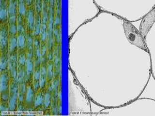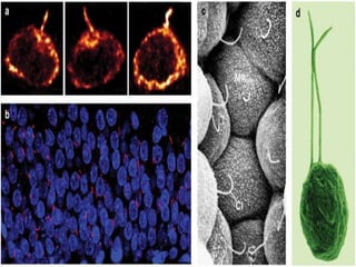 This document discusses microscopy and cell structure. It begins by describing different types of microscopes used to study cells, including light microscopes and electron microscopes. It then summarizes the key contributors to the Cell Theory, including Hooke, van Leeuwenhoek, Schleiden, Schwann, and Virchow. The rest of the document details the structures and organelles found within eukaryotic cells, including the nucleus, mitochondria, chloroplasts, endoplasmic reticulum, Golgi apparatus, lysosomes, vacuoles, cytoskeleton, and cell membrane. It emphasizes that cells are the basic functional units of living things.