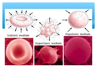 The document discusses various processes that cells use to exchange materials with their environment, including diffusion, osmosis, and active and passive transport. Diffusion is the movement of particles from high to low concentration without energy usage. Osmosis is the diffusion of water through a semi-permeable membrane. Passive transport includes osmosis and diffusion, while active transport requires energy and can move particles against a concentration gradient, such as endocytosis and exocytosis.